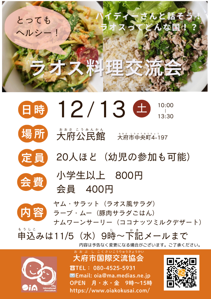 多文化料理交流会「ラオス料理」12月13日(土) 2025年10月29日 最終更新日時 : 2025年10月29日 大府市国際交流協会 11月5(水)9時からメールにて申し込み開始 ※料理はイメージです。