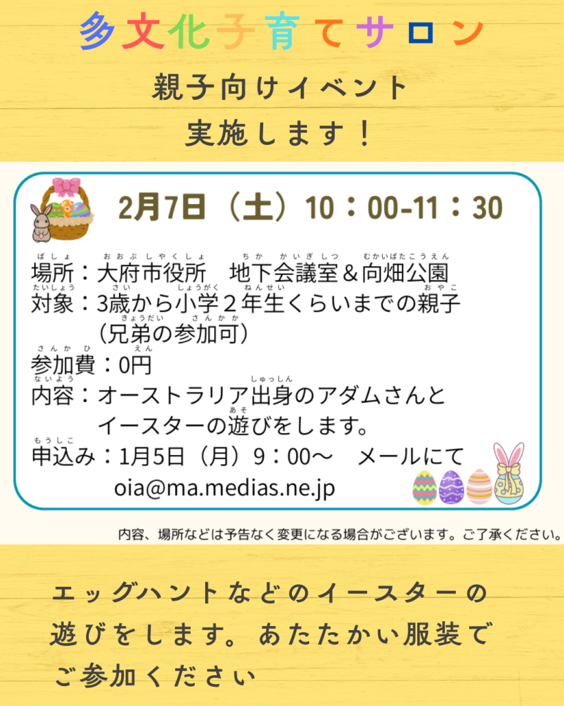 多文化子育てサロン④「アダムさんとイースターの遊びをしよう」2026年2月7日(土)10:00-11:30 2025年12月17日 最終更新日時 : 2025年12月17日 大府市国際交流協会 申し込み開始 1月5日(月) 9:00~